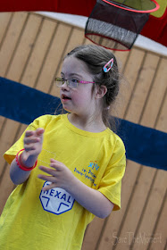 Übrigens trägt Jolina ein T-Shirt eines vergangenen Down Sportlerfestivals. Wir hätten auch dezentere Farben, aber gelb findet man in einer Halle voller Kinder einfach schneller. (Und da war doch ein praktischer Tipp für Eltern. Zieht euren Kindern immer auffällige Farben an, dann gehen sie nicht so leicht verloren)